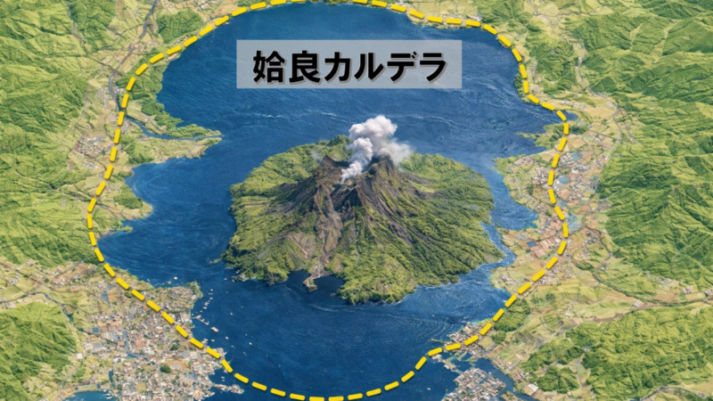この円の構造は、過去の大規模な火山活動によって地面が大きく落ち込んだ「コールドロン(陥没盆地)」という地形として説明されることがあります。